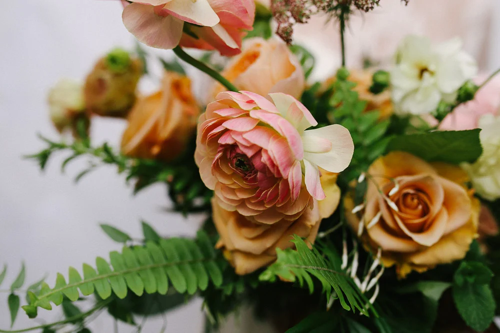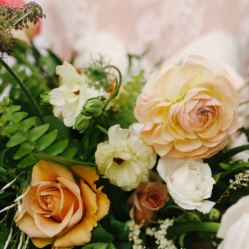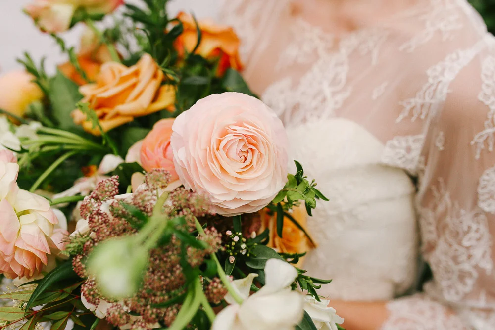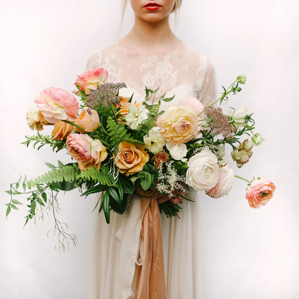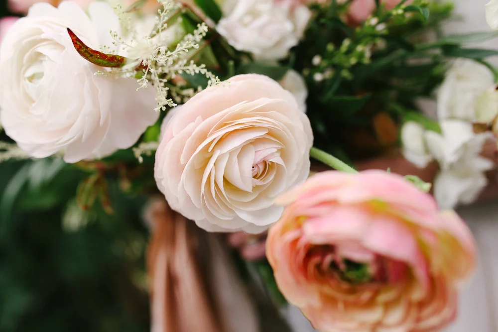 Inspired by colors of the sunset, this concept brought to life by Refine Studios and photographed by Mandi Nelson is filled with some shining star spring blooms like these huge Japanese ranunculus and tan lisianthus.